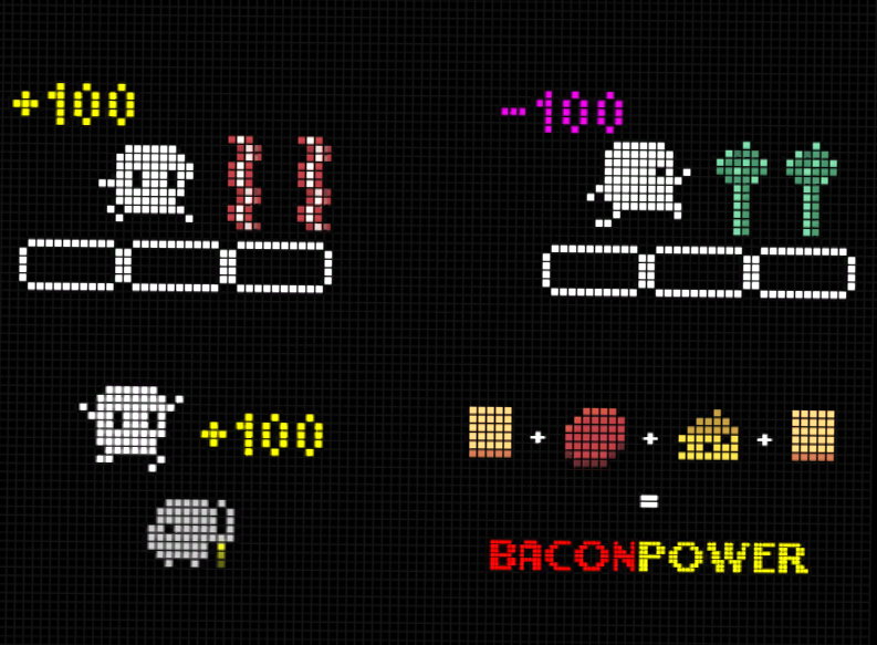 Kevin, the main character, has to defeat enemies, jump thru the gaps and manage to get the burger ingredients that trigger the Bacon Power (Flavour Explosion). All this with one single button: the space bar!